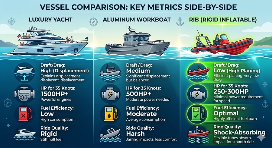 In maritime engineering, we often face a trade-off: Capacity vs. Performance. While a luxury yacht or a heavy aluminum workboat offers more deck space, they come with a high cost in fuel, maintenance, and physical impact. For the modern high-performance user, the rigid inflatable boat (RIB) offers a superior balance.